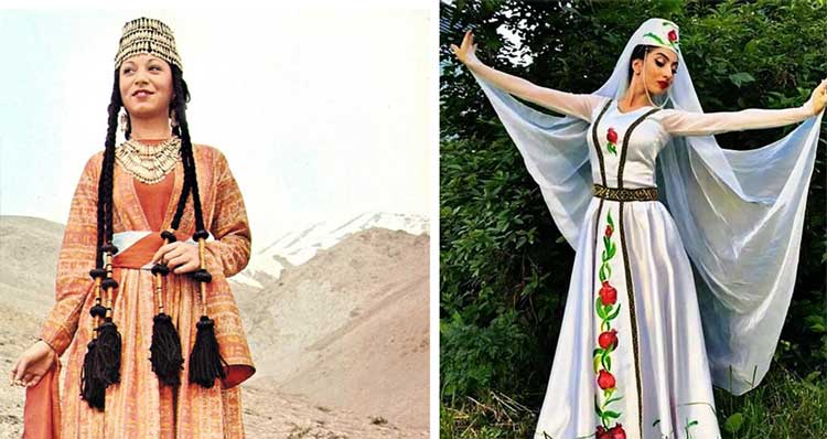 زنان با “آرخالیگ” (لباس بلند با شکاف سینه و ران)، روسری‌های ابریشمی و پیش‌بندهای گل‌دوزی‌شده، زیبایی را با سادگی ترکیب می‌کردند. رنگ‌ها نمادین بودند: قرمز برای شادی و باروری، آبی برای آسمان و معنویت، سبز برای طبیعت.